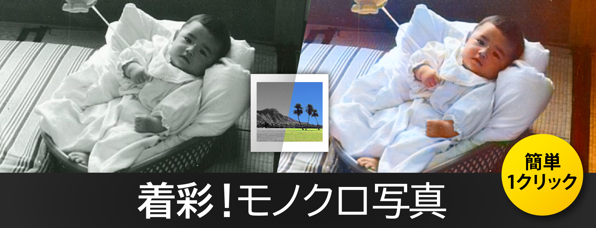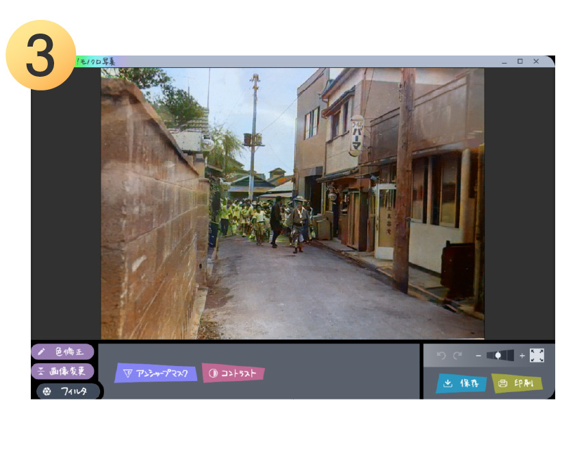 AIが学習したデータを元にモノクロ写真を解析。 人や空、森林、海などを認識して1クリックで自動的に着彩します。
