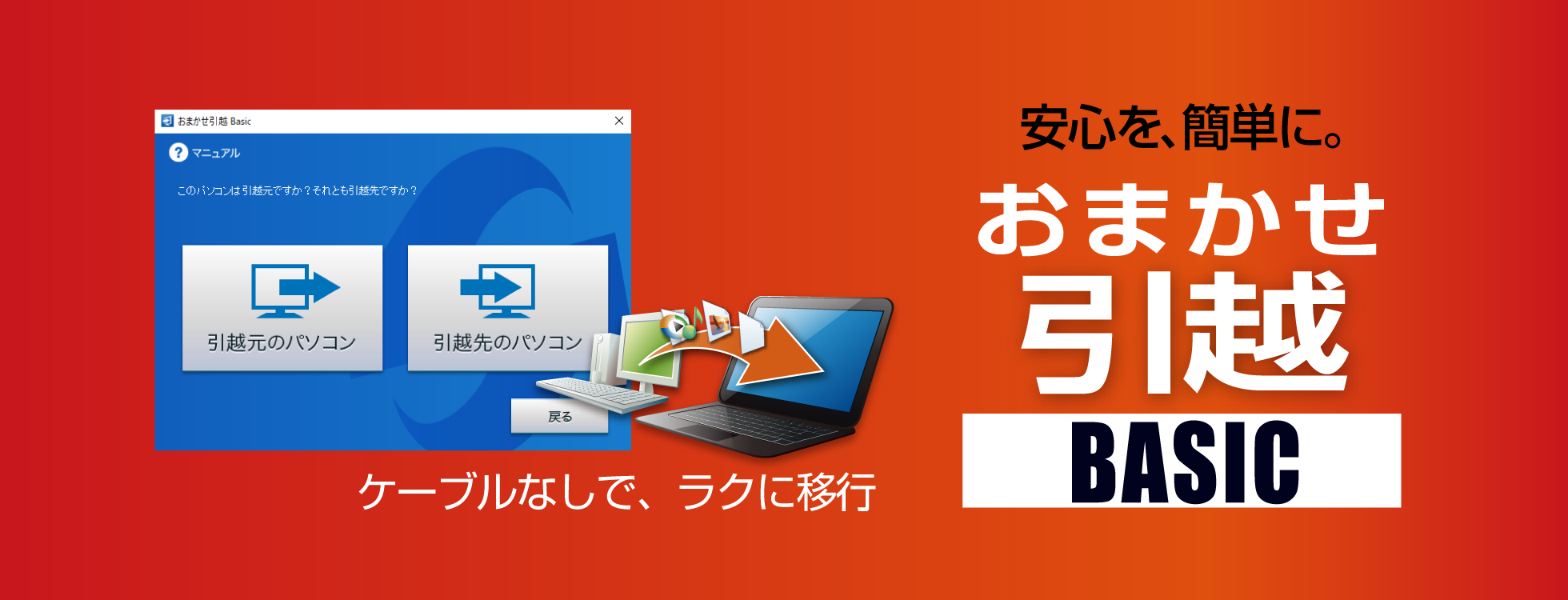 「おまかせ引越 Basic」は、パソコンのデータを別のパソコンに簡単にコピーできるソフトです。