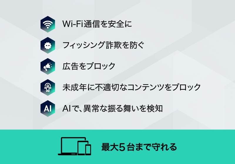 通信を暗号化し、プライバシーを守ります。さらに、広告のブロックや、AI搭載のセキュリティ機能が不審な動きや異常を検知するので安心です。