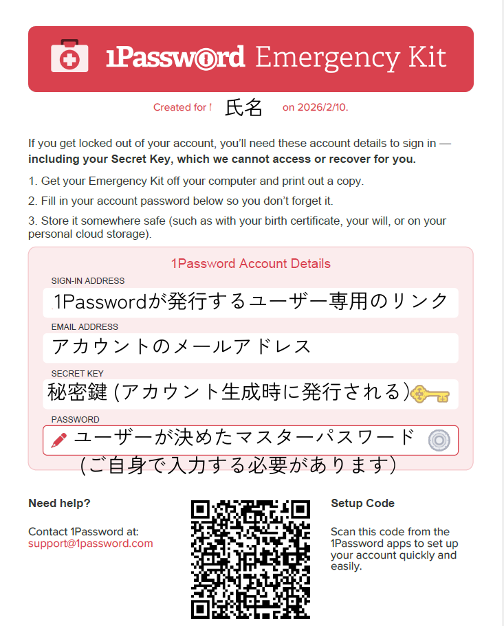 • 初回登録時にPDFで発行される「Emergency Kit」に記載されている秘密鍵で復旧
