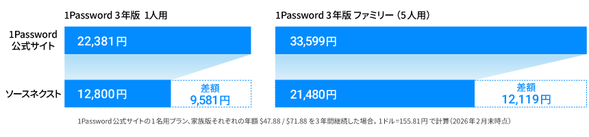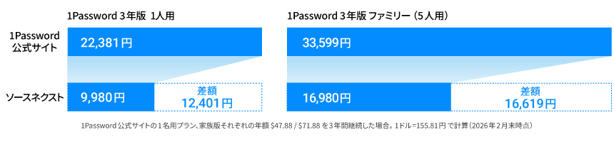 ソースネクストだけの3年版なら、公式サイトより12,401円お得です。 製品機能は、メーカー公式サイトで販売している1Passwordと同じです。