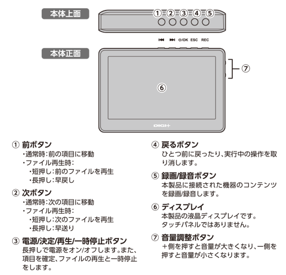 | インターフェース /スロット | USB type-Cポート(USB2.0)、音声出力端 子、映像音声入力端子、 HDMI出力端子、microSDメモリーカードスロ ット、USBポート |
