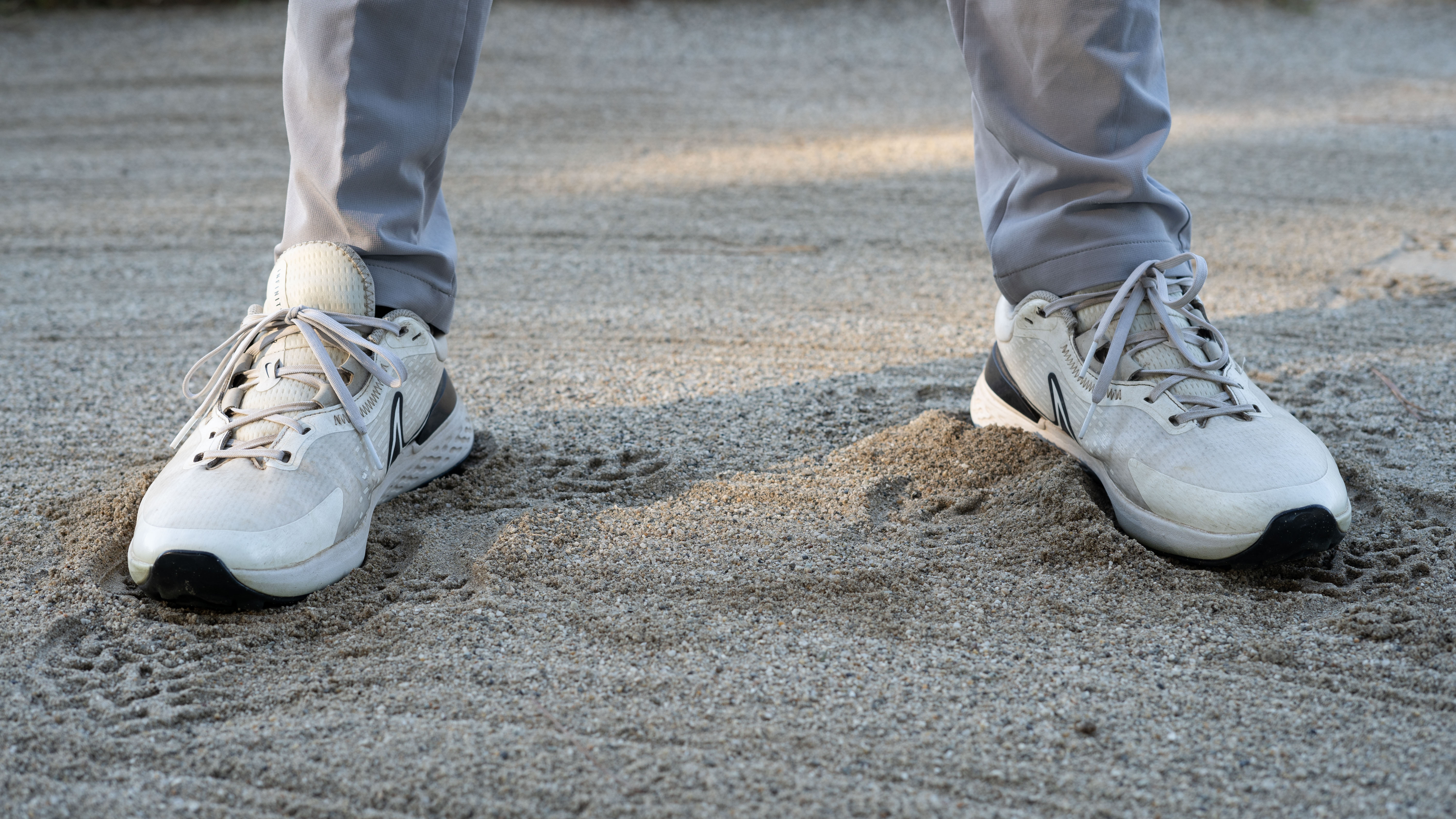 ボールは通常と同じかやや右足寄りにします。しっかりと振れるように足場はやや固めましょう(固めすぎはルール違反です)。