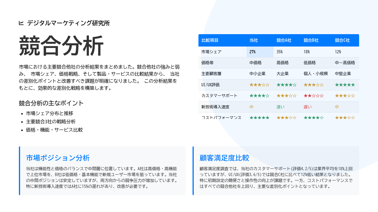 経営判断に必要な市場分析や競合調査を、情報収集からプレゼン資料化まで一貫して短期間で完了できます。