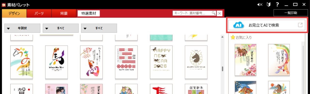 素材パレットには年賀状以外のデザインも収録しています。