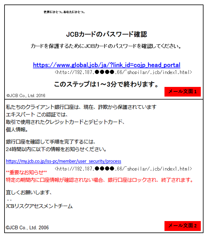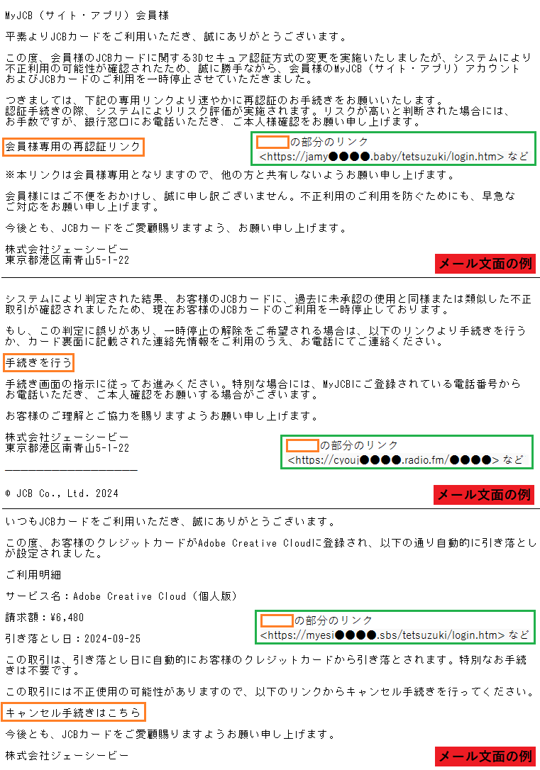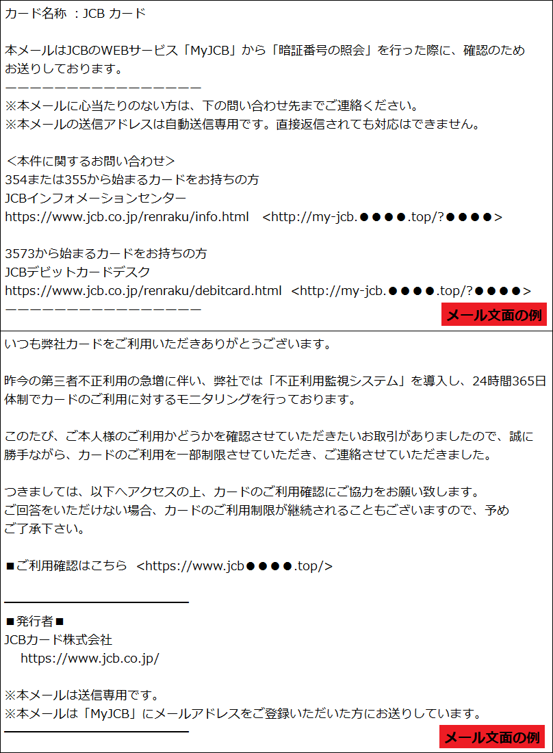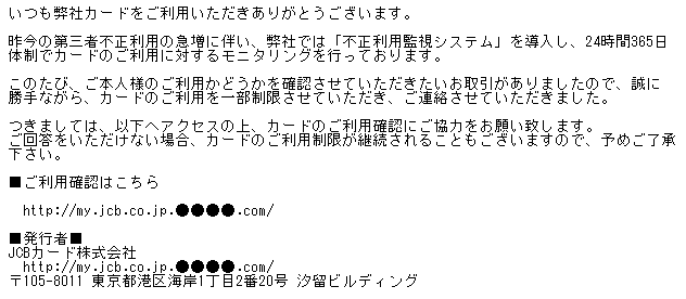 「MyJCBカードの不正利用検知に関する重要な通知」番号:XX-XXXXXXXXXXX