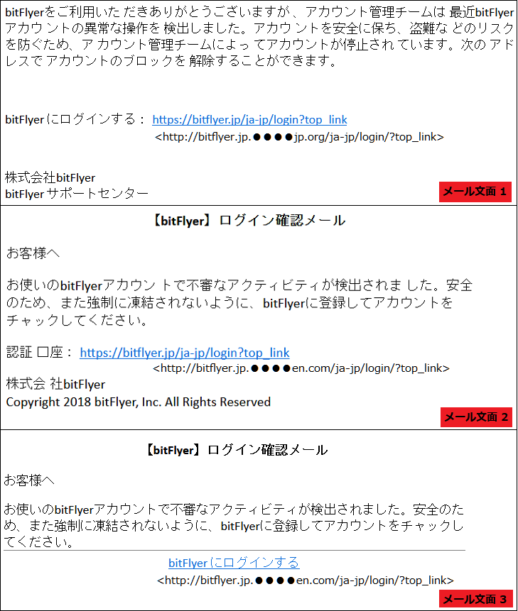 仮想通貨取引所「bitFlyer」を騙るフィッシング詐欺が確認されたため、フィッシング対策協議会が注意を呼びかけています。偽のWebサイトへ誘導してアカウント情報 (メールアドレス・パスワード) を入力させようとするものですのでご注意ください。