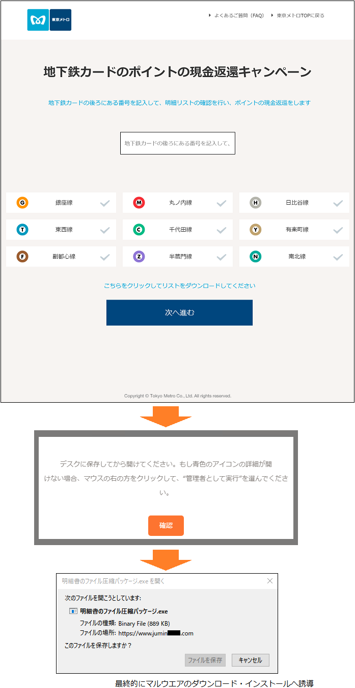 「東京メトロ」を騙ったフィッシング詐欺が増加していると、フィッシング対策協議会が注意を呼びかけています。偽のWebサイトへ誘導してカード情報を入力させたり、不審なファイルのダウンロードやインストールをさせようとするものです。ご注意ください。