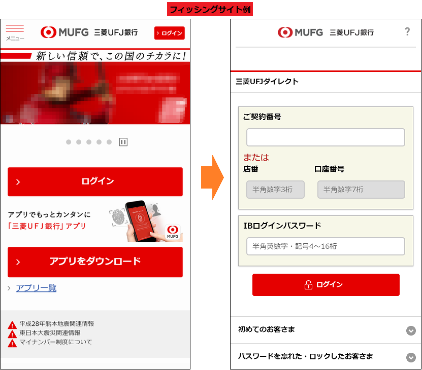 「三菱UFJ銀行」を騙ったフィッシング詐欺が増加していると、フィッシング対策協議会が注意を呼びかけています。偽のWebサイトへ誘導して以下の情報を入力させようとするものですのでご注意ください。