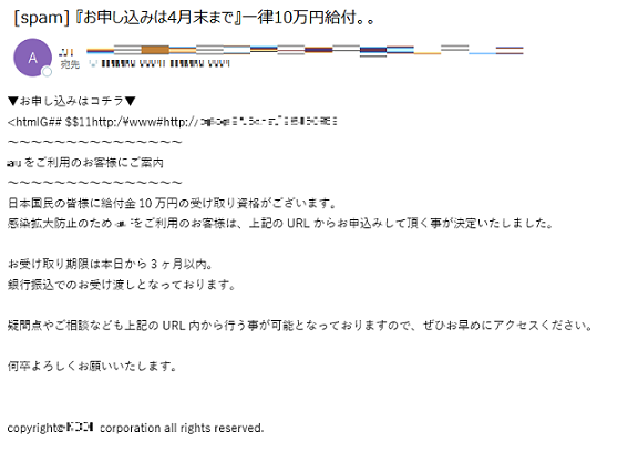 昨年10月に出回った「特別定額給付金に関するフィッシングメール」が、現在も出回って