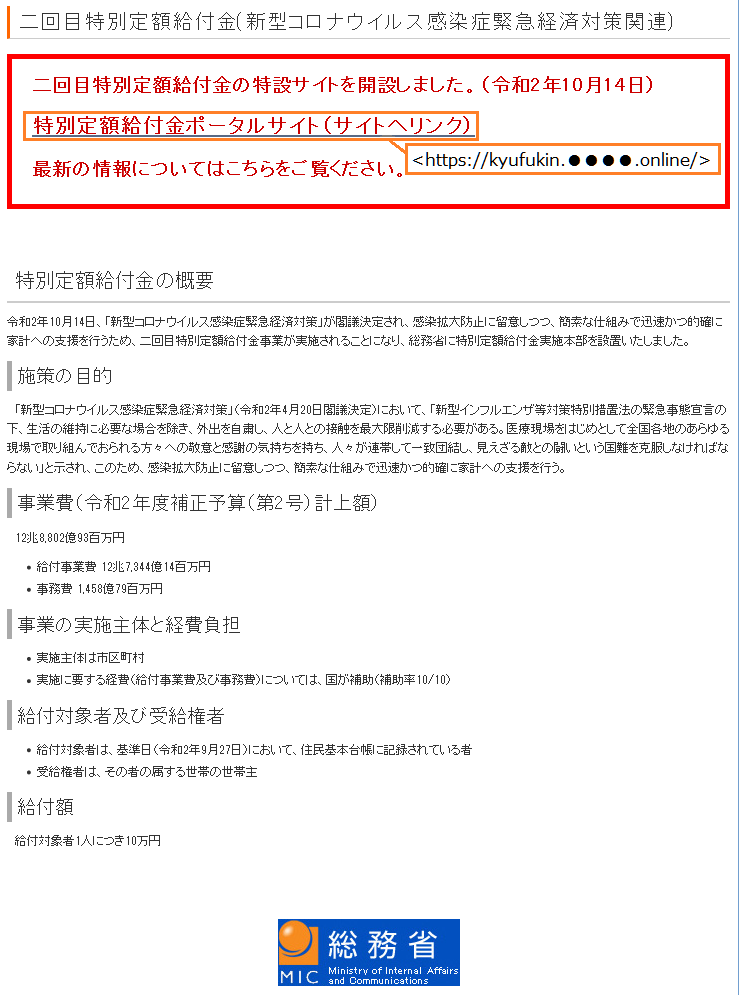 【特別定額給付金】二回目特別定額給付金の特設サイトを開設しました。