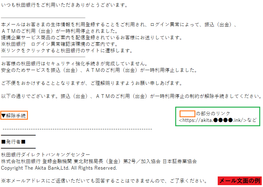 「秋田銀行」を騙ったフィッシング詐欺が増加していると、フィッシング対策協議会が注意を呼びかけています。偽のwebサイトへ誘導してログイン情報などを入力させようとするものですのでご注意ください。