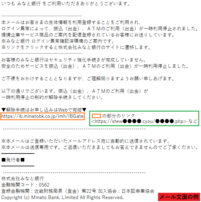 「みなと銀行」を騙ったフィッシング詐欺が増加していると、フィッシング対策協議会が注意を呼びかけています。偽のwebサイトへ誘導してログイン情報などを入力させようとするものですのでご注意ください。