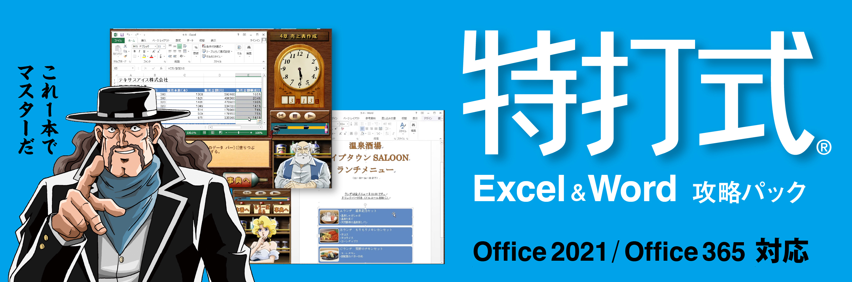 「特打」は大ヒットした西部劇仕立てのタイピング習得ソフトのシリーズ。さびれた西部の酒場の片隅でキーボードを拳銃に見立て、練習を練習と感じさせないゲーム感覚の早撃ち修行でタッチタイピングをマスターします。特打式は、同じ登場人物たちがOfficeソフトを特訓するシリーズです。