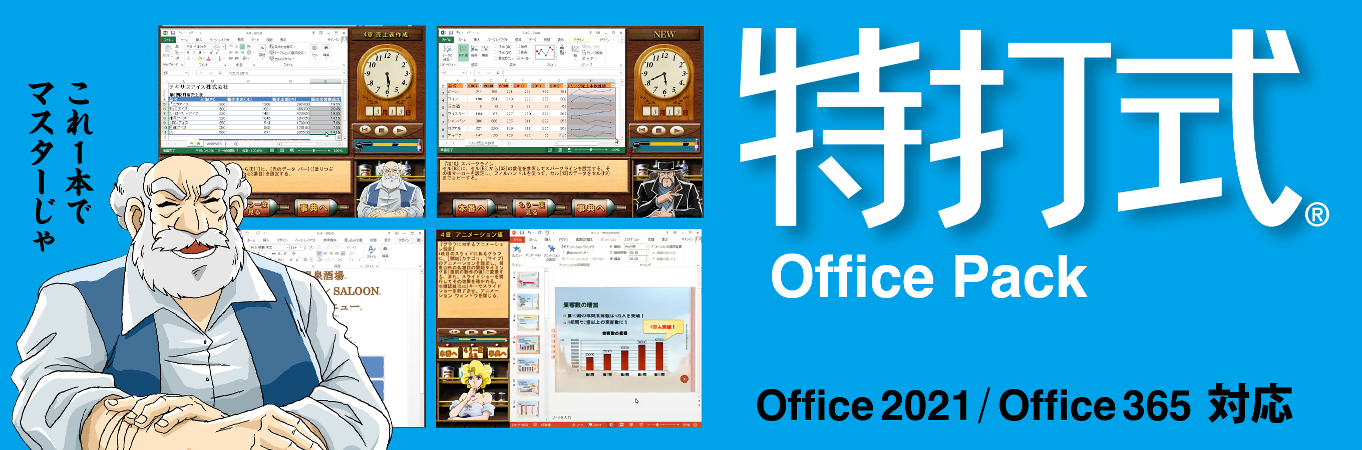「特打式」は、ゲーム感覚のOffice習得ソフトです。そのパソコンに入っているOfficeと融合した、お手本を見てその場で試して学ぶ実践的なレッスン。